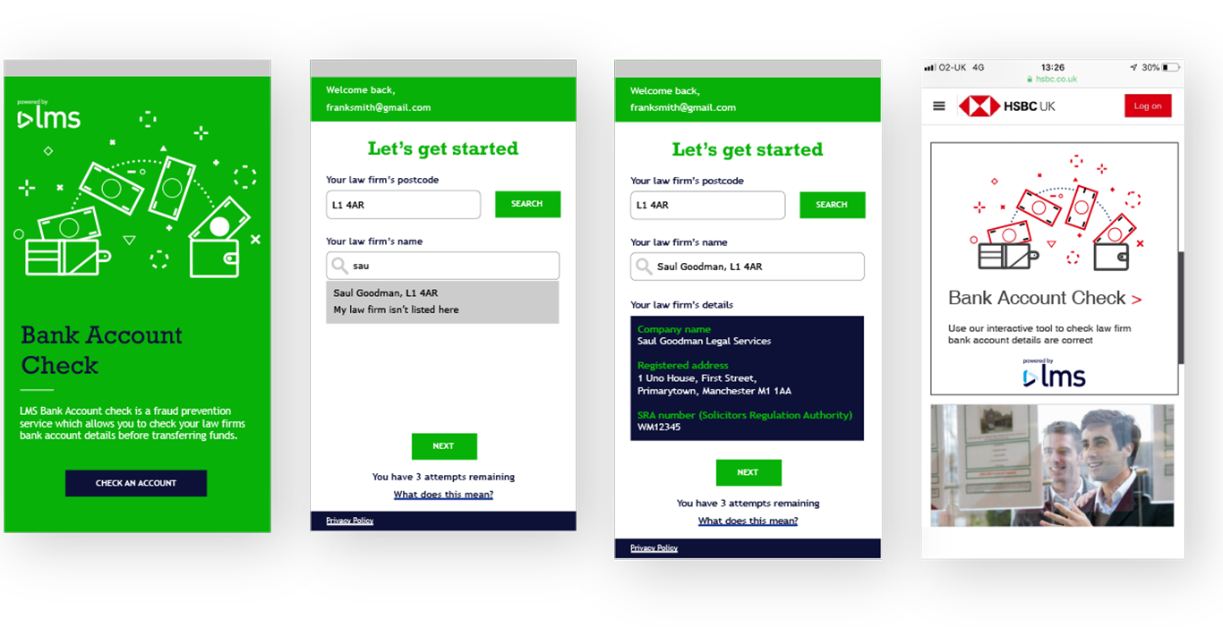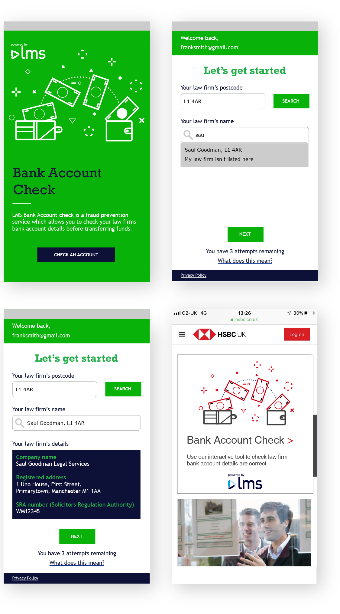 LMS Bank Account Check was developed as a fraud prevention solution which allows borrowers to check their law firms bank details before transferring funds.